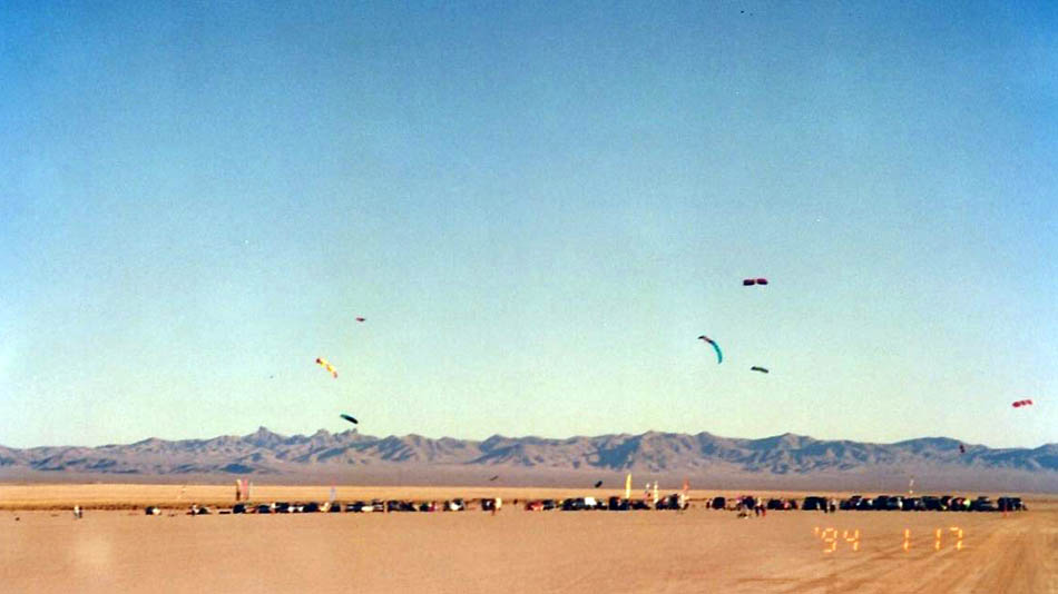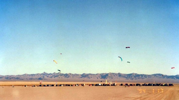 Christi Crawford Partee – The Early Days USA » 01 View of the cars and kites from a distance at the 1st ever Buggy Boogy Thang- Jan. 1994-at Lake Ivanpah, CA